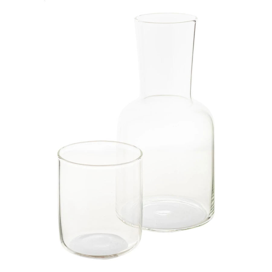 Boroszilikát üveg vizes kancsó (800 ml) és ivópohár (300 ml) készlet. Kraft papír dobozban. Hideg és meleg italokhoz egyaránt alkalmas, dekantáló üvegként is használható.