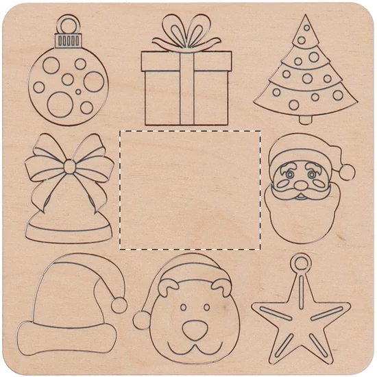 | Karácsonyi színezős formakereső játék rétegelt nyírfából, juta tasakban. Tematikus kivágott figurákat (8 db) és fa színes ceruzákat (12 db) tartamaz, papírdobozban. | |
