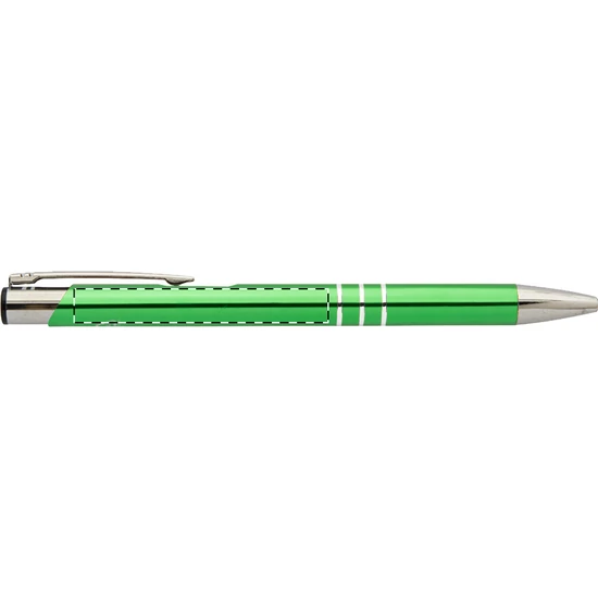 | Újrahasznosított alumínium golyóstoll, fémes felülettel és kék tollbetéttel. | |