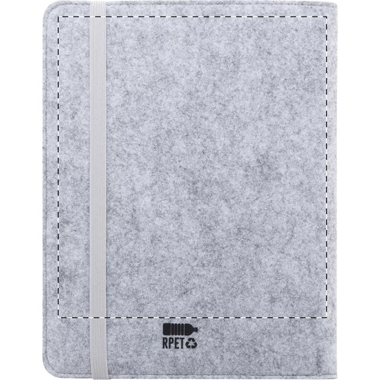 A5-ös méretű, RPET filc iratmappa elülső és több belső rendezőzsebbel. 20 vonalas jegyzettömbbel újrahasznosított papírból.