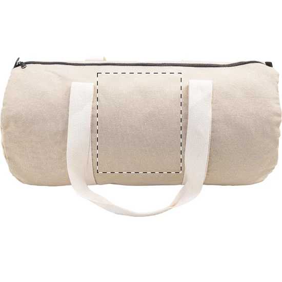 Újrahasznosított vászon sporttáska cipzáras fő rekesszel, cipzáras belső zsebbel és hosszú fogantyúkkal. 70% újrahasznosított pamut és 30% újrahasznosított poliészter. Megkülönböztető újrahasznosított pamut címkével.