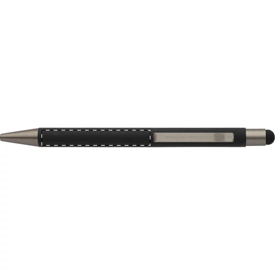 Újrahasznosított alumínium és érintőképernyős golyóstoll gumírozott testtel és fegyverfém részekkel. Kék tollbetéttel.