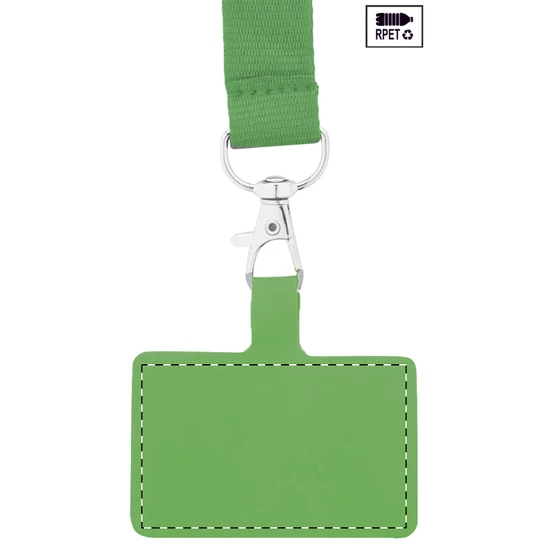 RPET mobiltartó nyakpánt fém karabinerrel, biztonsági csattal és hozzáillő színű telefonbetéttel.