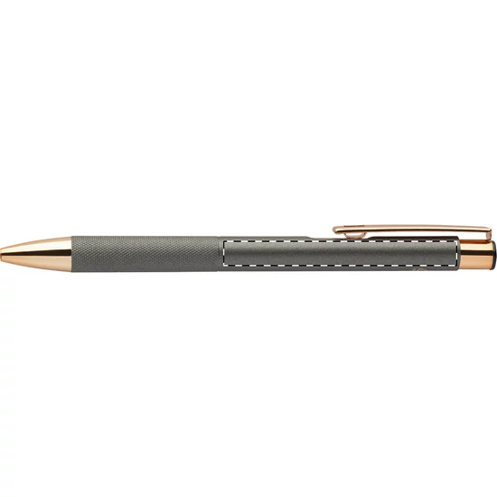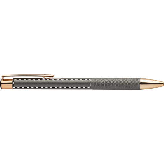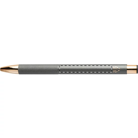 Újrahasznosított alumínium golyóstoll matt felületű testtel, texturált markolattal és rózsaarany részletekkel. Speciális bevonattal a tükörlézeres gravírozáshoz rózsaarany színben. Kék tollbetéttel.