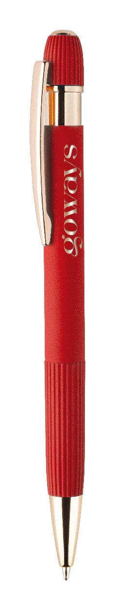 | Újrahasznosított alumínium golyóstoll gumírozott testtel és rózsaarany részletekkel. Speciális bevonattal a tükörlézeres gravírozáshoz rózsaarany színben. Kék tollbetéttel. | |