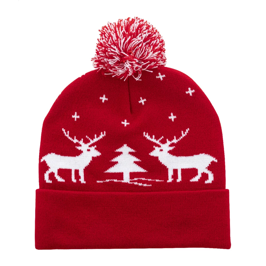 Kötött karácsonyi sapka akrilból, mandzsettával és bojttal.