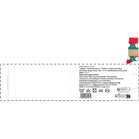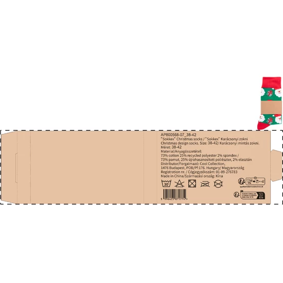 Egy pár karácsonyi zokni 73% pamutból, 25% RPET poliészterből és 2% spandexből. Emblémázható kraft papír csomagolással. |