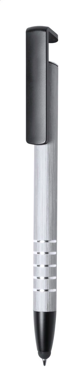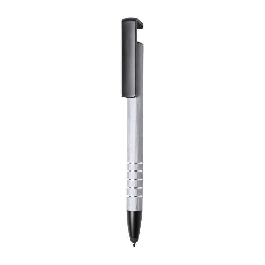 | Alumínium golyóstoll érintőképernyős véggel és telefontartó funkcióval. Kék tollbetéttel szállítjuk. | |