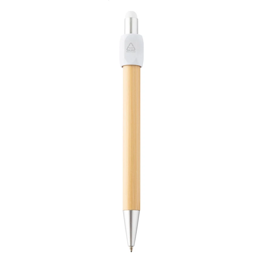 Bambusz érintőképernyőstoll újrahasznosított ABS műanyag pörgettyűvel. Kék tollbetéttel.