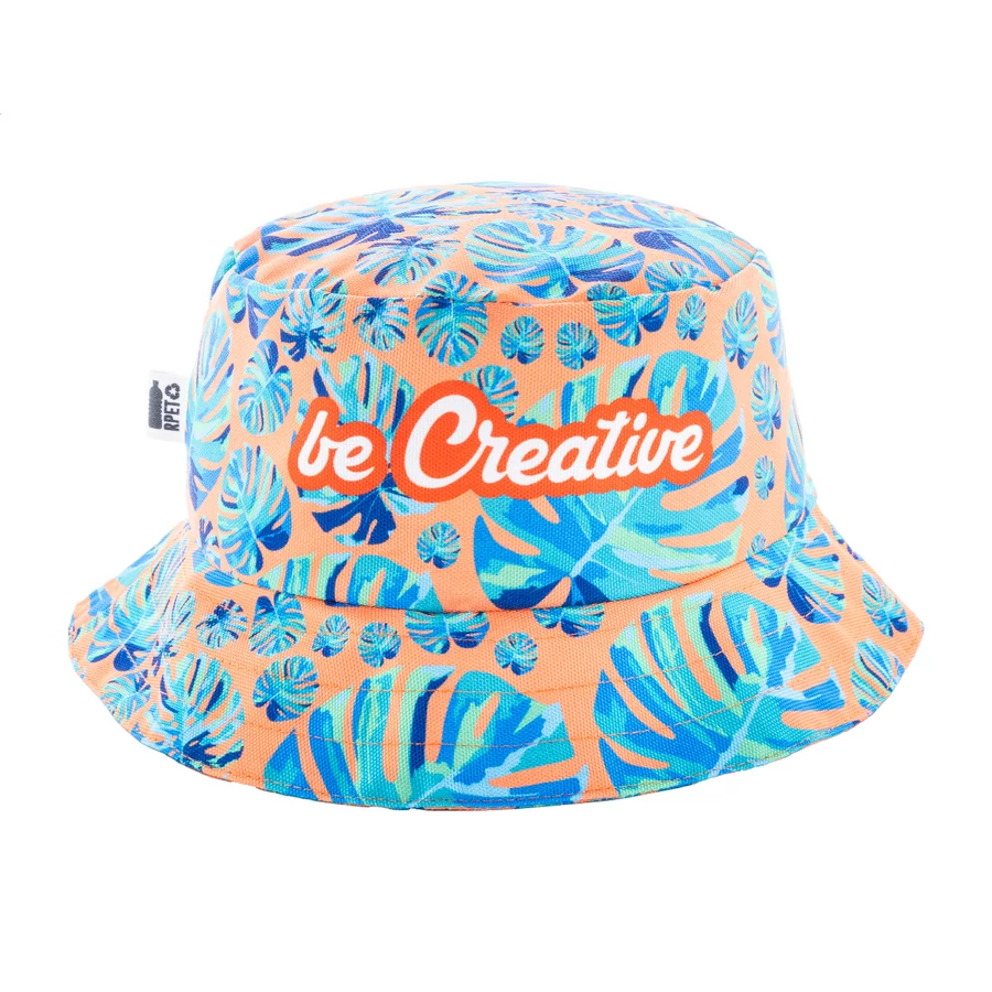 Egyedi gyártású RPET halászsapka, teljes felületén szublimációs nyomtatott grafikával. 600D RPET poliészterből (220 g/m²) készült, megkülönböztető RPET címkével. Minimális rendelési mennyiség: 25 db / méret. 3 méretben kapható: S (⌀55cm gyereknek), M (⌀58cm) és L (⌀60cm).