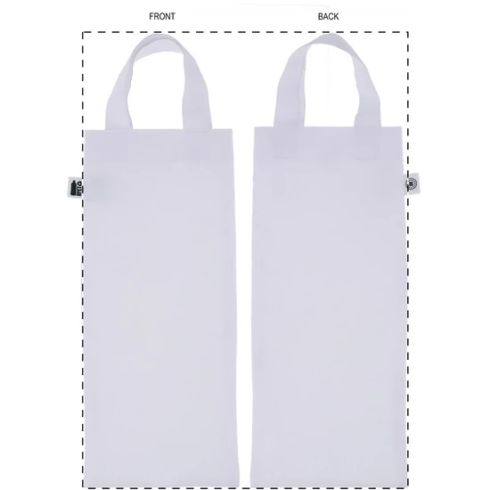 Egyedi gyártású, 600D RPET poliészter boros tasak rövid fülekkel. Teljes felületén szublimációs grafikával és megkülönböztető RPET címkével. Minimális rendelési mennyiség: 25 db.