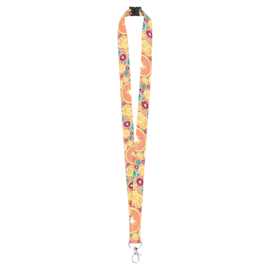 Egyedi grafikával ellátott poliészter nyakpánt fém karabinerrel és biztonsági csattal. Mindkét oldalán szublimációs technológiával emblémázva. Minimum rendelési mennyiség: 100 db.