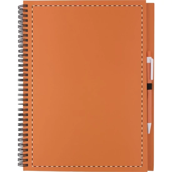 Karton borítású A4-es, 80 sima lapos spirál jegyzetfüzet, megegyező színű újrahasznosított papír golyóstollal. A terméket kék tollbetéttel szállítjuk.