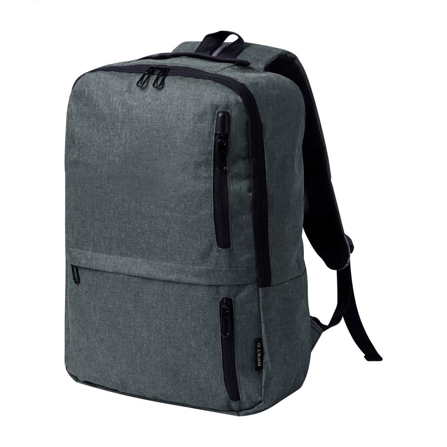 RPET hátizsák cipzáras rekeszekkel, párnázott laptop (15") és tablet (10") rekesszel, párnázott hát- és vállpántokkal. 600D RPET poliészter, megkülönböztető RPET címkével.