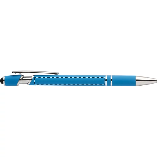 | Újrahasznosított alumínium golyóstoll gumírozott testtel és króm részletekkel. Kék tollbetéttel. | |