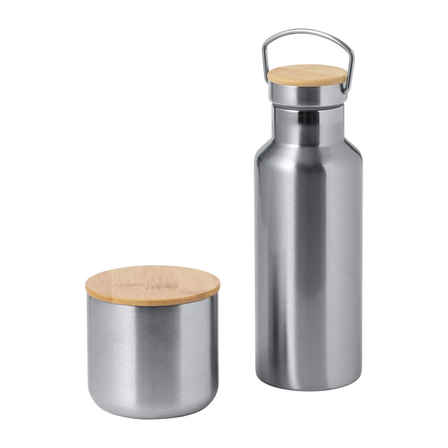 | Duplafalú, rozsdamentes acél termosz (500 ml) bambusz hordfedéllel és duplafalú, rozsdamentes acél pohár. Kraft papír dobozban. | |