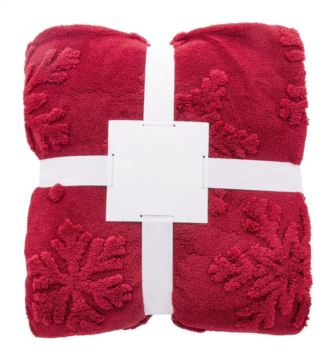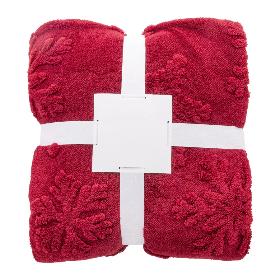 Luxus, kétrétegű RPET karácsonyi takaró jacquard hópehely mintával. 260 g/m² RPET korall polár és megfordítható 210 g/m² RPET sherpa polár béléssel. Szalaggal és nyomtatható papírkártyával csomagolva.