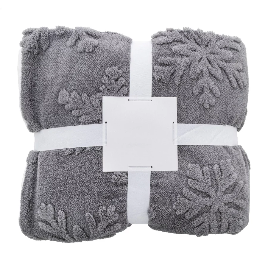 Luxus, kétrétegű RPET karácsonyi takaró jacquard hópehely mintával. 260 g/m² RPET korall polár és megfordítható 210 g/m² RPET sherpa polár béléssel. Szalaggal és nyomtatható papírkártyával csomagolva.