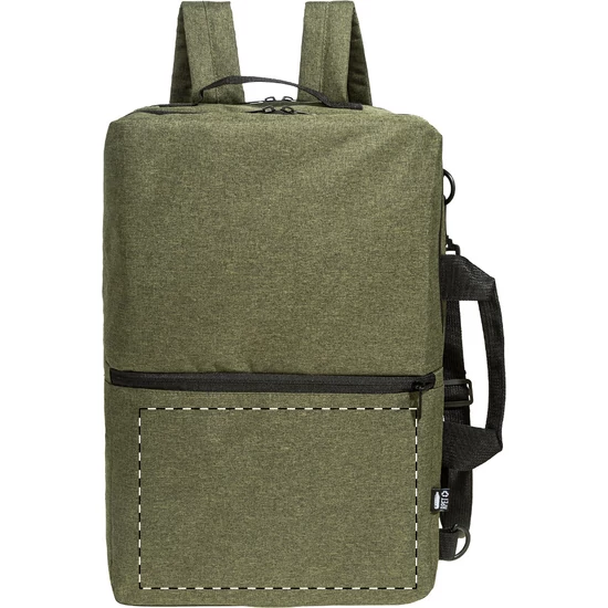 | Kétfunkciós RPET dokumentum hátizsák cipzáras rekesszel, 2 cipzáras elülső zsebbel és párnázott laptop rekesszel (15"). Párnázott hátrésszel és vállpántokkal. Tartalmaz egy további levehető vállpántot, amely irattáskaként is használható. 600D RPET poliészter, megkülönböztető RPET címkével. | |