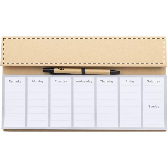 | Újrahasznosított papírból készült asztali tervező szett 50 dátum nélküli heti tervezőlappal, 100 öntapadós jegyzettel (4 színben) és 125 oldaljelölővel (5 színben). Újrahasznosított papír golyóstollal, kék tollbetéttel. | |