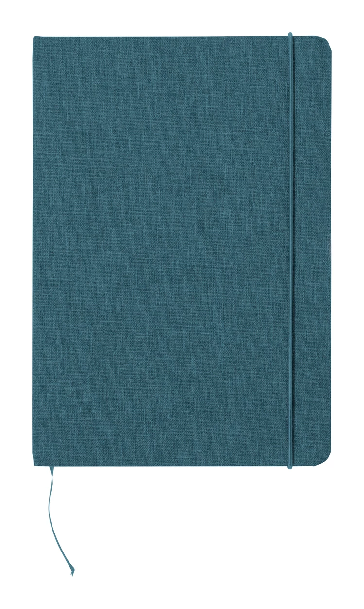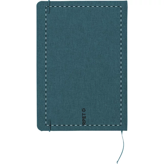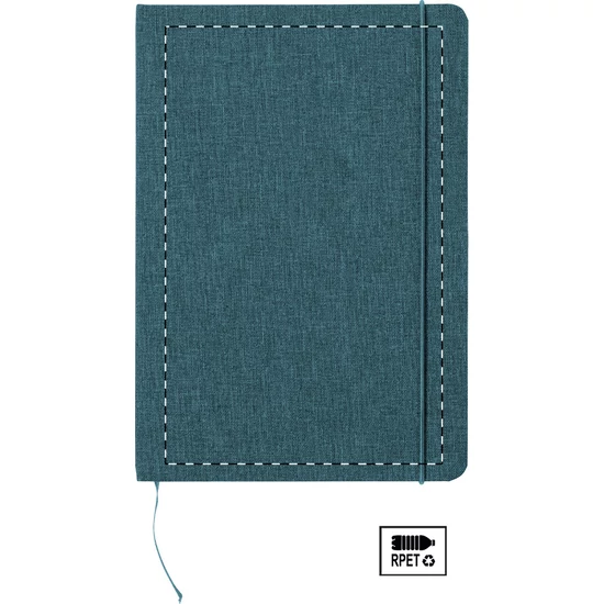 300D RPET poliészter borítású jegyzetfüzet 80 sima lappal. Hozzáillő színű gumipánttal, könyvjelzővel és tolltartóval. A5 méretű.