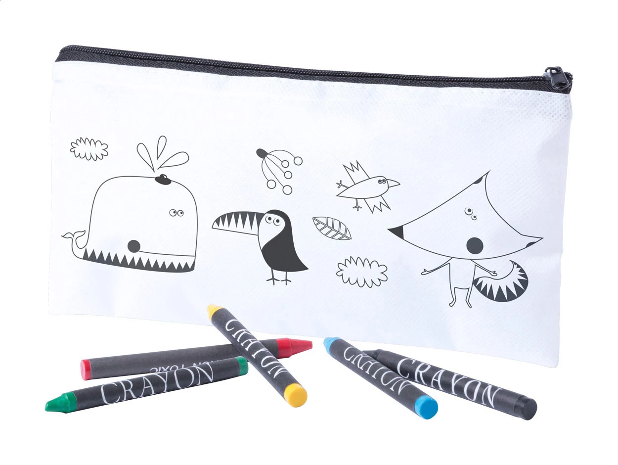 Non-woven anyagból készült színezhető, cipzáras tolltartó gyerekeknek, 5 db zsírkrétával.