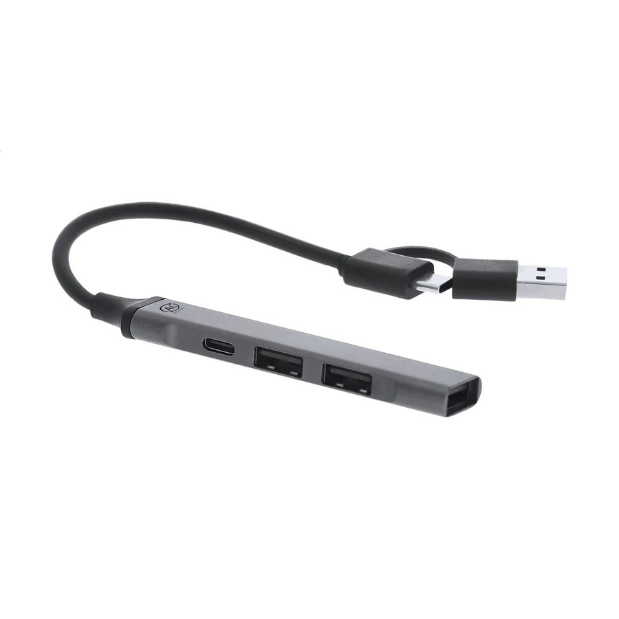 Újrahasznosított alumínium USB hub 3 USB (USB 2.0) és 1 USB-C (USB 3.0) porttal. USB és USB-C csatlakozós kábellel szállítjuk.